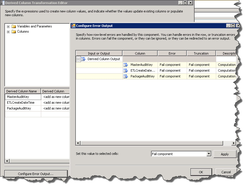 map the “User::RowCount”, “User::RC_Error”, “User::AuditKey”, and “User::RC_Xtrct”.